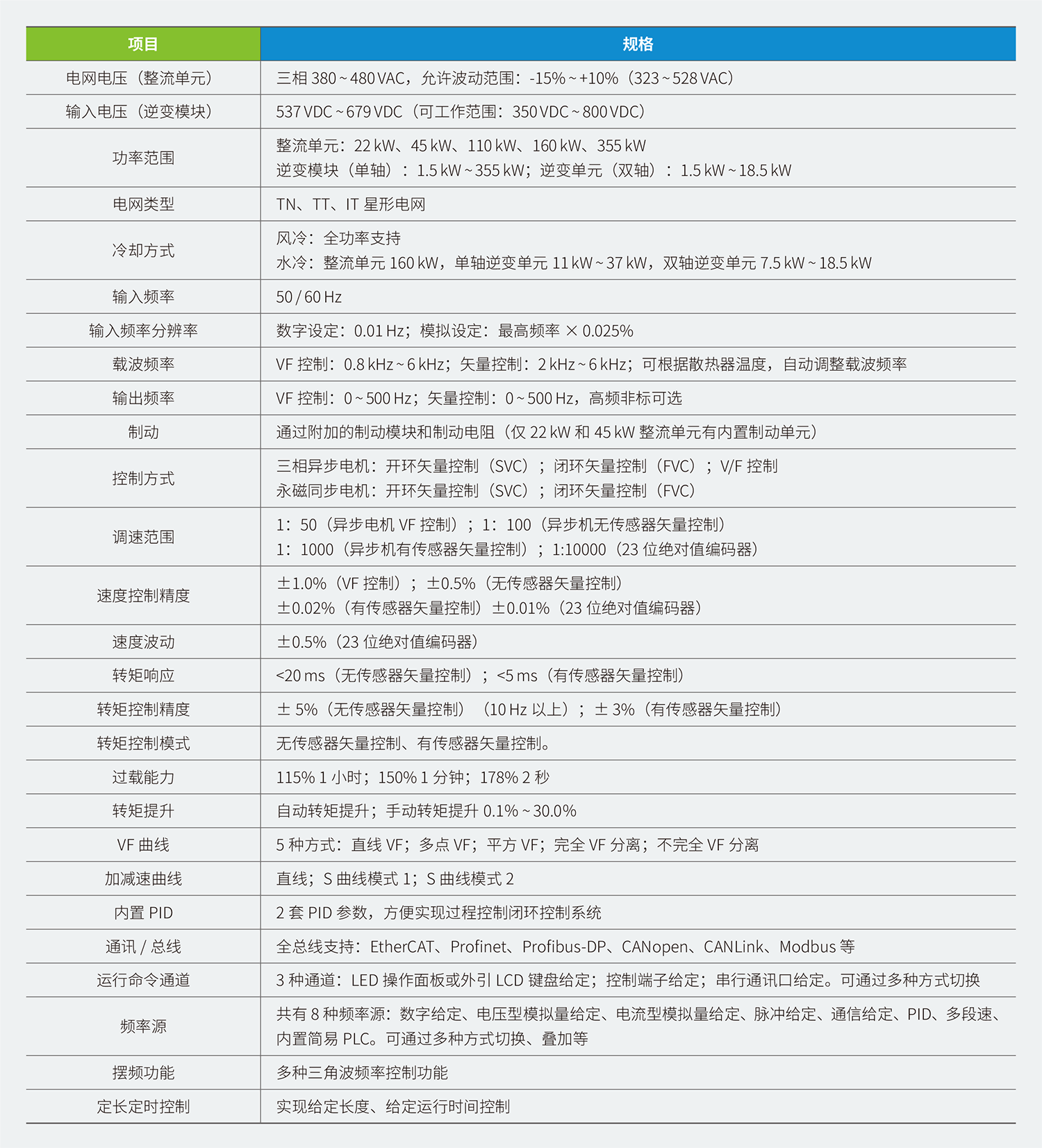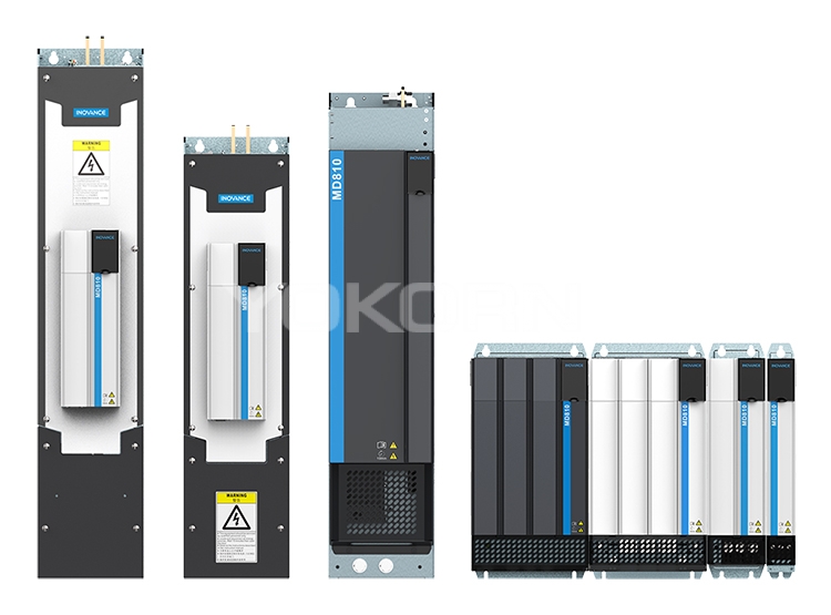 匯川MD810系列高性能多機傳動驅動器?產(chǎn)品介紹 MD810 標準型多機傳動變頻器是匯川新一代低壓多點傳動系統(tǒng),突破了國外多點傳動的技術堡壘和壟斷格局,開創(chuàng)了多傳變頻產(chǎn)品在中國OEM 行業(yè)應用的先河。匯川MD810 與AM610 / H3U 等PLC 高速總線組網(wǎng),實現(xiàn)一網(wǎng)調試,一網(wǎng)驅控,兼容異步及同步伺服電機,搭載23 bit 絕對值編碼器,打造最強變頻驅動。 產(chǎn)品特性及優(yōu)點 1、MD810 功率范圍:整流單元 22 ~ 355 kW,逆變單元1.5 ~ 355 kW,具備單雙軸兩個版本,雙軸二合一性價比更高 2、全總線支持:EtherCAT、Profinet、Profibus-DP、CANopen、CANLink、Modbus 等 3、編碼器支持類型:① 增量式;② 23 位絕對值;③ 增量式 / 旋變+ 分頻輸出;④ 增量式+ 增量式 / 23 位絕對值 / 正余弦 / SSI+ 分頻輸出 4、高效配電的共直流母線設計,提升系統(tǒng)電能效率,實現(xiàn)5% ~ 30% 節(jié)能 5、等高等深書本型模塊設計,實現(xiàn)并排緊湊安裝,柜體利用率高,占地面積小,電氣一體化成柜可實現(xiàn)移動機載 6、每個模塊單元內置Mini型旋轉搭片式母線連接方式,將部件集成到最小空間,減少冗余系統(tǒng)器件,降低配電成本 7、自適應調試,一網(wǎng)連接,5 分鐘完成整線調試 8、標準軟件集成張力控制、同步控制、定位控制等 10 余種高端工藝,應用宏 9、變頻 + 伺服一體化應用,可實現(xiàn) 1 圈 800 萬脈沖絕對值定位控制 |